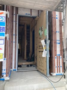 本日は岡谷ホームズのお家づくりの様子、外壁工事をご紹介します。まず、雨水の侵入を防ぐためにたてものの構造用合板に透湿防水シートを貼ります。次に通気胴縁の木材を取り付けます。防湿シートとサイディング材の間に空気層ができ、壁内部の湿気を排出することができます。